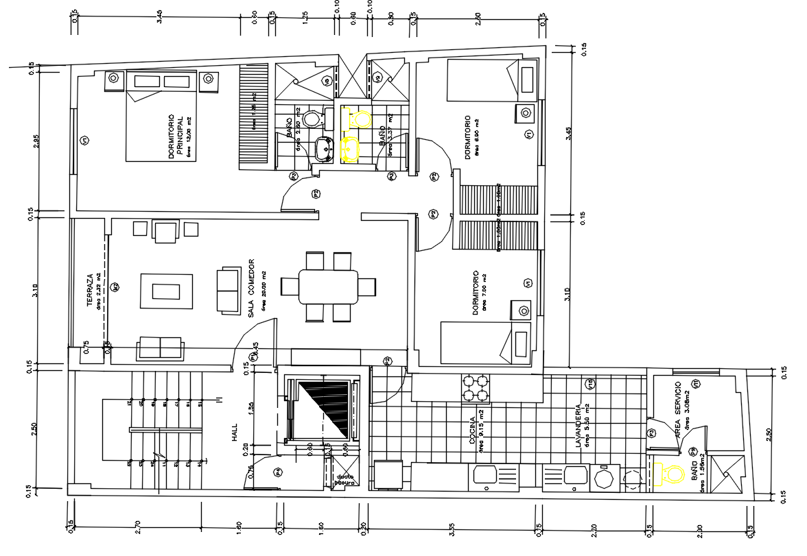 3 Bedroom House Plan with Furniture Layout Drawing Download DWG File