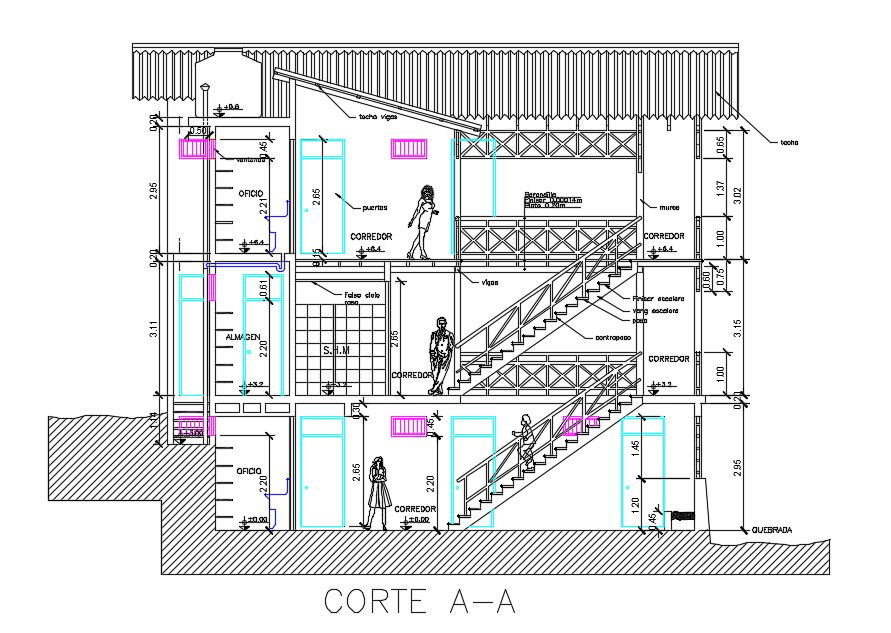 The AutoCAD house section CAD drawing that shows The building has 9 m in height. The building has G+2 story, elements on layers in dwg file.