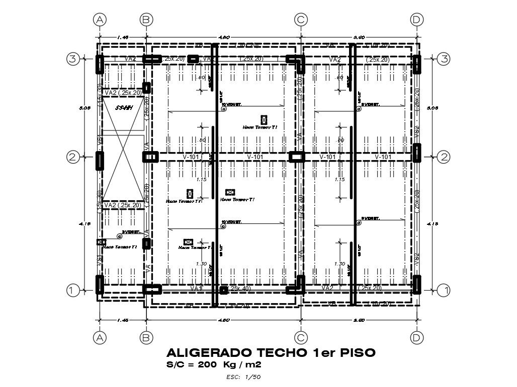 First floor column layout of 10x7m office plan is given in this Autocad drawing file. Download now.