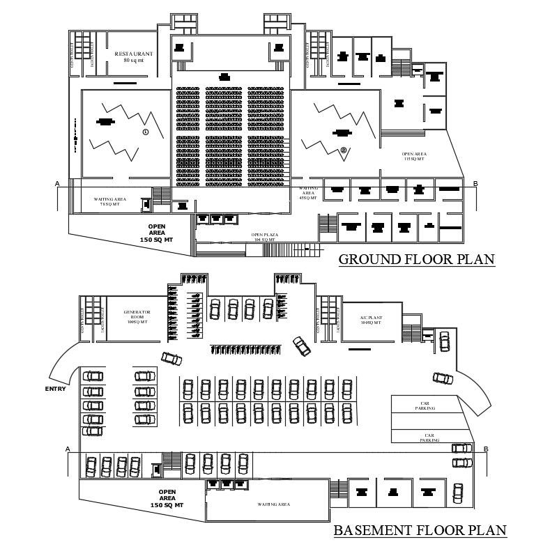 The architecture office floor plan AutoCAD drawing ground floor and basement parking lot plan. this CAD drawing shows 800 sq mt auditorium hall, 80 sq mt restaurant, 25 sq mt offices, maintenance staff room, electrical room, toilet, 100 sq mt generator room and 150 sq mt waiting area detail in dwg file. Thank you for downloading the AutoCAD drawing file and other CAD program files from our website.