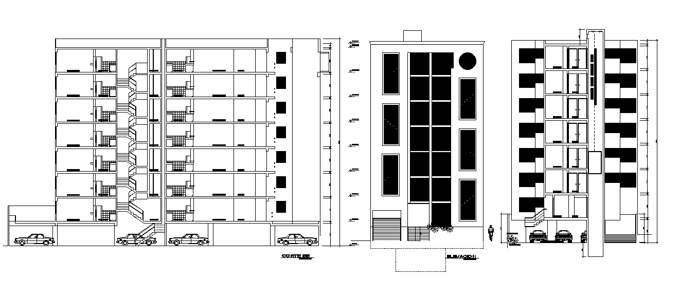 The architecture residence apartment building sectional elevation design CAD drawing which includes vehicle parking on the ground floor, standard staircase, glass door window marking, and all dimension detail in dwg file. Thank you for downloading the AutoCAD drawing file and other CAD program files from our website.