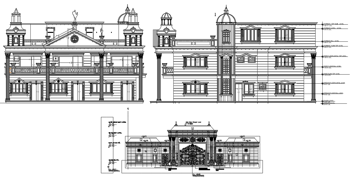 The traditional villa building front and side elevation design that shows door window marking, a gallery with railing wall, column, terrace dome detail. also has the main entrance iron grill gate design dwg file. Thanks for downloading the file and another CAD program from the cadbull.com website.
