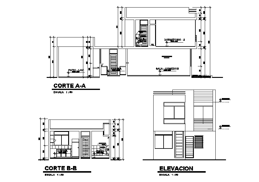 the residence house building section drawing and elevation design that shows 2 bedrooms house with all dimension detail. the total 6X15 meter plot size house breadth and length detail. Thanks for downloading the file and another CAD program from the cadbull.com website.