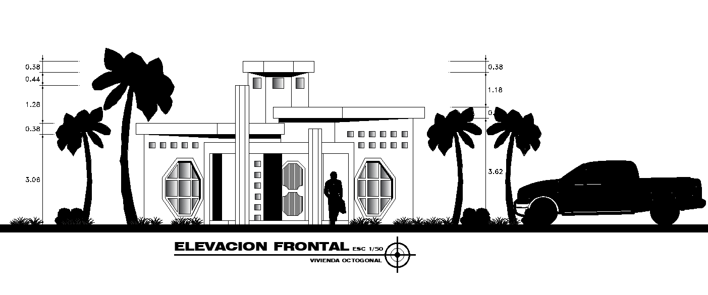 the residence house building front elevation design that shows single storey floor level building model design, this is 2 bedrooms house project and its look modern concept house design and total 5.5 meter height of building model design dwg file. Thanks for downloading the file and another CAD program from the cadbull.com website.