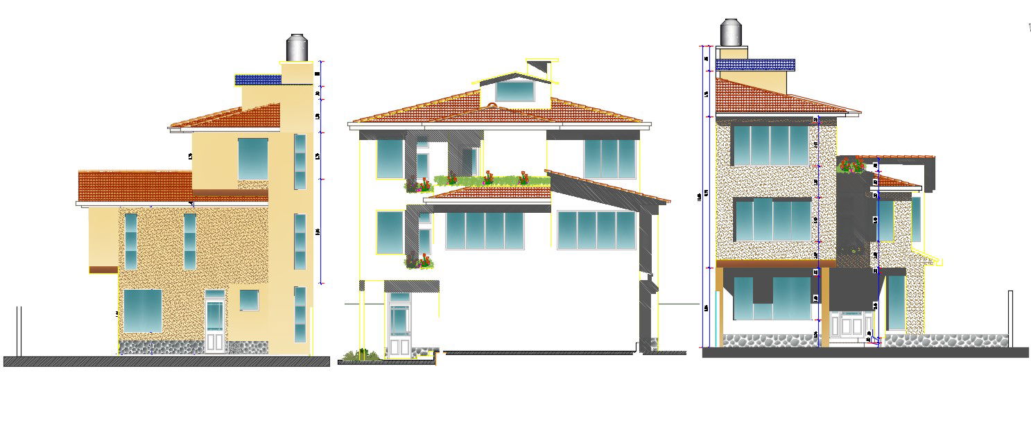 Three sides Architectural 2D Elevation Drawing of the G+2 house is given in this AutoCAD DWG drawing. The front and side view of the elevation is clearly given in this drawing file. Also, the glass window, Exterior Wall colors, roof designs look good in this DWG drawing plan. This drawing will be very useful for civil engineers and architects. Thank you so much for downloading the DWG file from the cadbull website. Download the AutoCAD DWG file.
