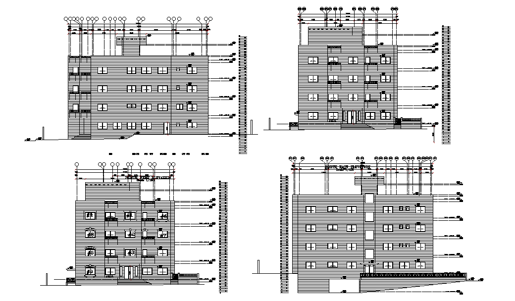 The residence apartment building all side elevation design that shows G+3 storey floor level building model design, door window marking, centre line with dimension detail, and uses AutoCAD hatching design for improving the CAD presentation. Thanks for downloading the file and another CAD program from the cadbull.com website.