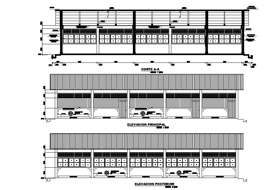 the school building sectional elevation AutoCAD drawing that shows truss span roof, door window marking, and column with dimension detail in dwg file. Thanks for downloading the file and another CAD program from the cadbull.com website.