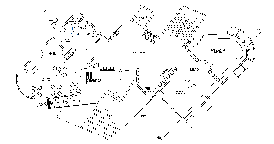 the hospital layout plan AutoCAD drawing that shows wheelchair and stretcher bay, pharmacy, pathology lab, waiting lobby, stretcher lift, cafeteria, kitchen, consult room, and toilet with all dimension measurement detail dwg file. Thanks for downloading the file and another CAD program from the cadbull.com website.