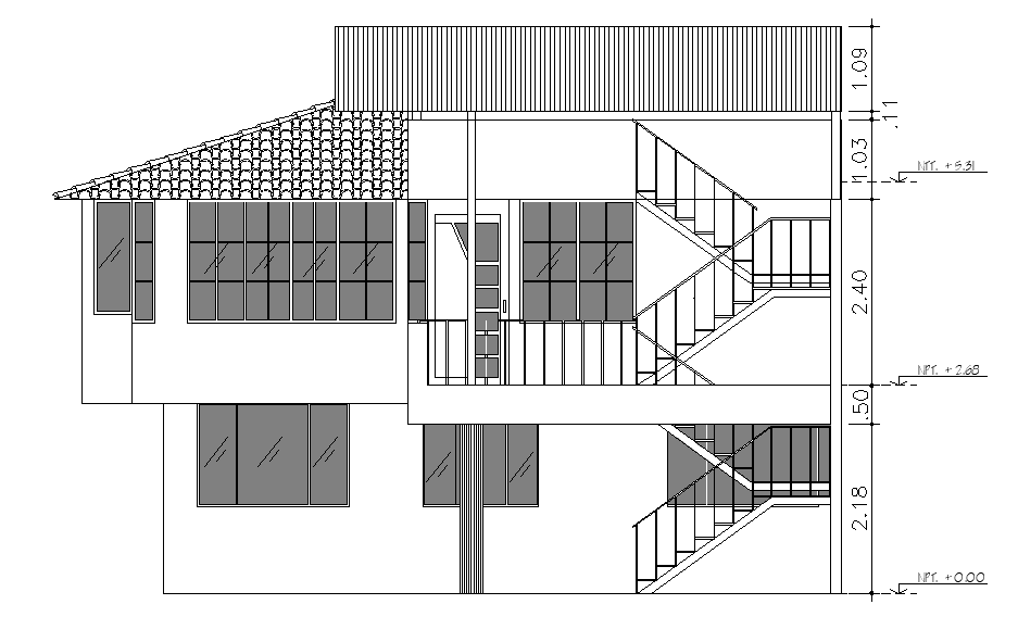 The residence house building front elevation design that shows G+1 storey floor level building model design, staircase with railing wall, glass window, door and clay span roof design dwg file. Thanks for downloading the file and another CAD program from the cadbull.com website.