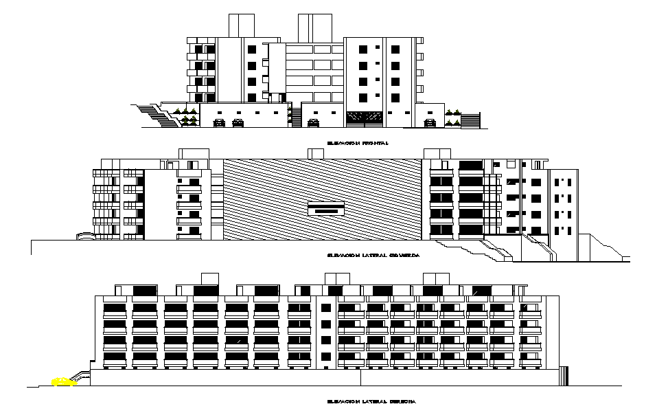 The architecture apartment building all side view elevation design that shows 4 storey floor level building model, gallery view, car parking basement and door window marking detail dwg file. Thanks for downloading the file and another CAD program from the cadbull.com website.