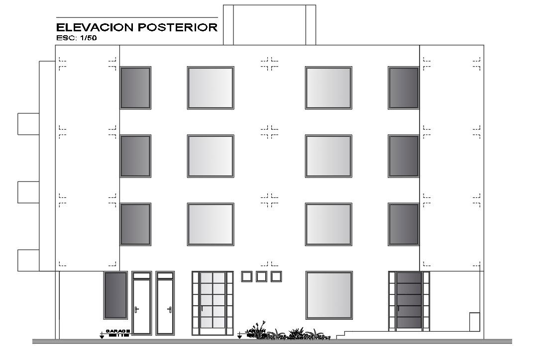 Back elevation drawing is specified in this CAD file. this file consists of, G+3 story floor level building with window detail, balcony elevation, single door with ventilation detail, standing wall detail, main entrance detail given in this file. Thanks for downloading the file and another CAD program from the cadbull.com website. Download 2d AutoCAD drawing file.