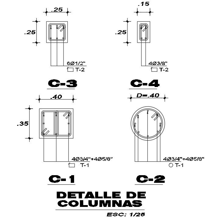 Column detail drawing as c1, c2, c3, c4 type separated in this AutoCAD file. this file consists of steel bar detail given and drawing made in 1:25 scale with detailed dimensions and specifications in this file. this can be used by architects and engineers. Download this 2d AutoCAD drawing file.