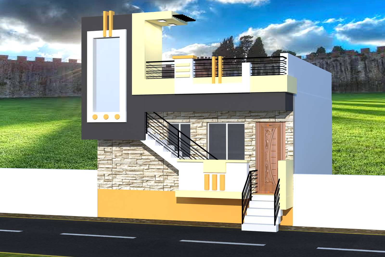 This is a single story building elevation in which one main door and two windows are provided and in the staircase tower the plain glass is provided and this building is in three colors combination