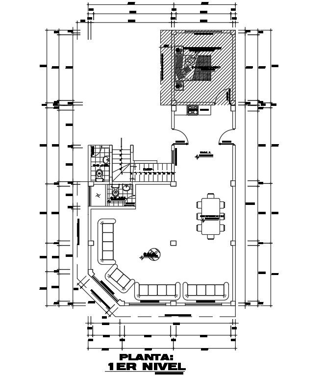 Resort floor plan drawing defined in this cad file. this file consists of facade area, living area, bedroom, dining area, column placements, staircase, and washroom detail given with dimensions and specifications. this can be used by architects and engineers. Download this 2d AutoCAD drawing file.