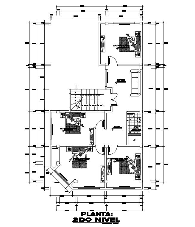Bungalow second floor plan drawing specified in this cad file. this file consists of a 4 bhk bungalow floor plan with column placements, staircase, furniture detail, and washroom detail given with dimensions and specifications. this can be used by architects and engineers. Download this 2d AutoCAD drawing file.