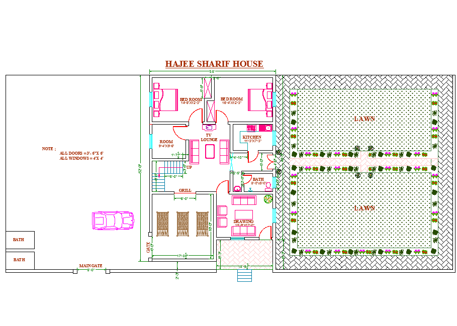 Modern house designs and floor plans. Main Gate Design, Lounge, Kitchen, Living room, ALL DOORS = 3'- 6"X 6', ALL WINDOWS = 4'X 4'. floor plan.