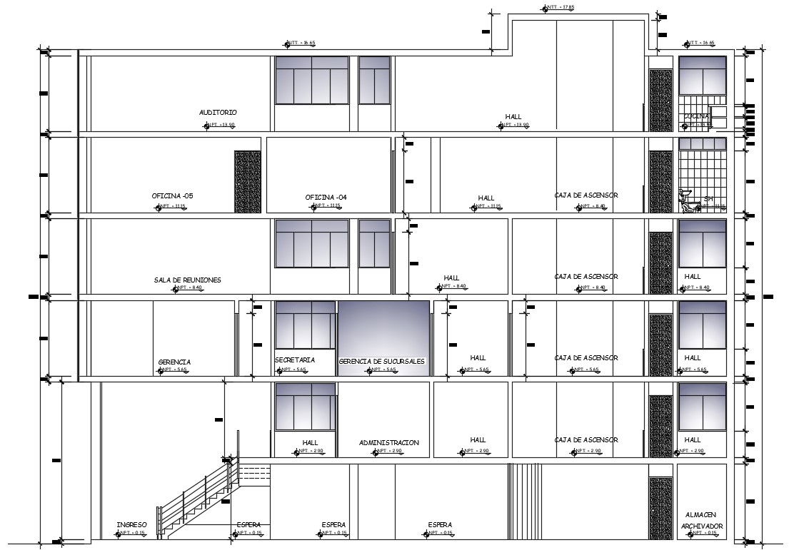 Side elevation of G+5 office building CAD drawing details. In this cad drawing plan, the glass window view, staircase, is clearly shown. It is very useful for structural engineers, Architect, and civil engineers. Thanks for downloading CAD and other CAD program files on the CADBULL.COM website. Download now.
