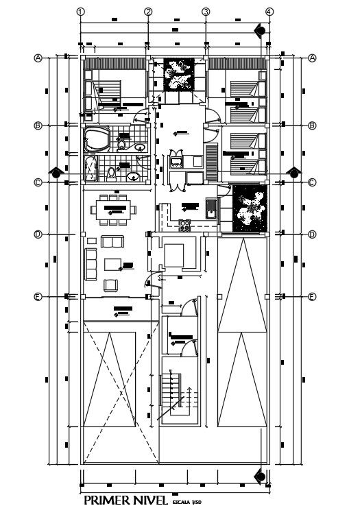 Bungalow floor plan furniture design derived in this cad file. this file consists of a living room, dining area, children's room with column placements, staircase, furniture detail, and washroom detail given with dimensions and specifications. this can be used by architects and engineers. Download this 2d AutoCAD drawing file.