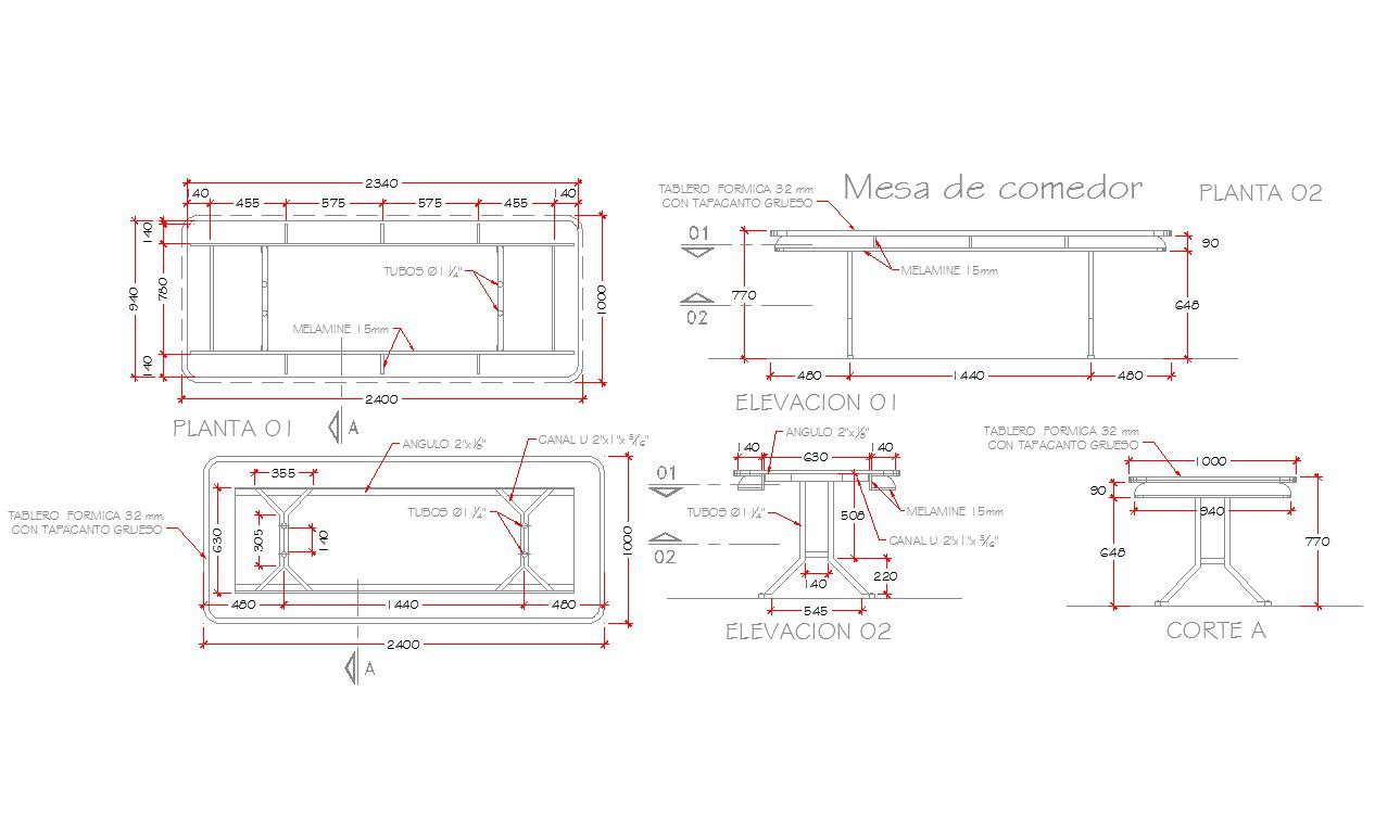 Different types of kitchen tables design in DWG file, formica 32 mm board with thick tapacanto, melamine 15mm, canal u 2"x1"x 3/16", etc detail.