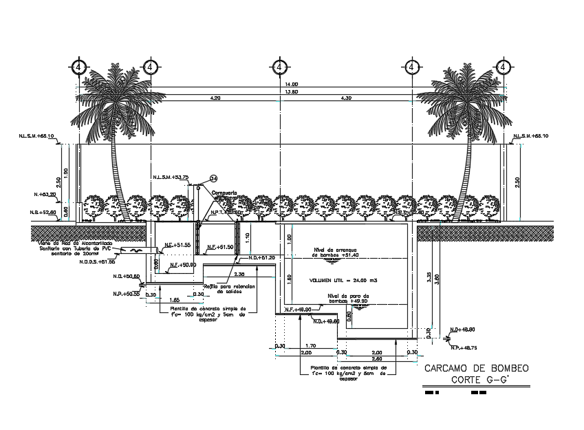 The car washing garage section drawing which consist pumping, simple concrete template of f'c = 100 kg / cm2 and 5cm thick, grid for retention of solids, comes from sewer network sanitary with 20cm pvc sanitary pvc pipe, and pump starting level +51.40 detail dwg file. Thank you for downloading the AutoCAD file and other CAD program files from our website.