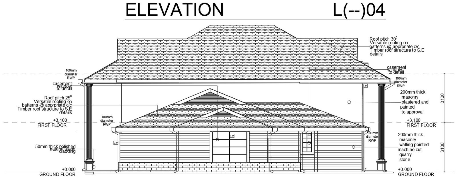 the administration office building elevation design that shows truss span roof pitch, versatile roofing on bitterns, appropriate timber roof structure to S.E detail, casement window, 200mm thick masonry plastered and painted, and walling pointed machine cut quarry stone detail dwg file. Thank you for downloading the AutoCAD file and other CAD program files from our website.