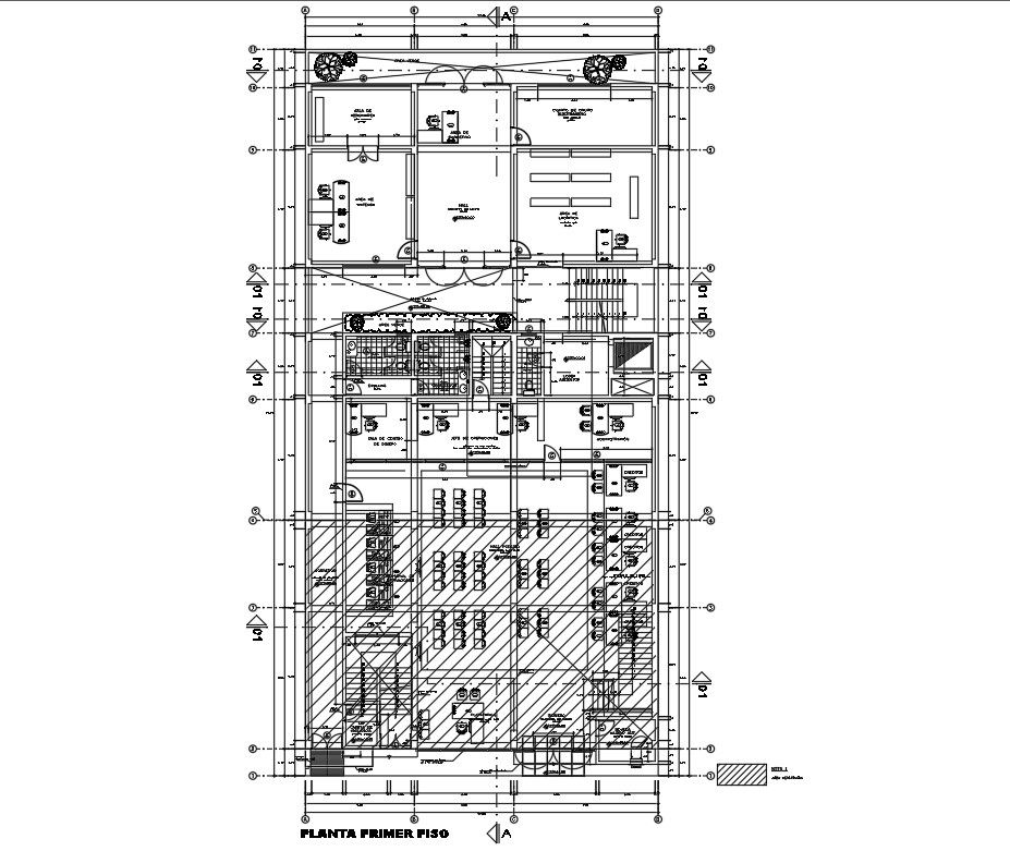 17x35m first floor bank plan is given in this Autocad drawing file. Download the Autocad file.