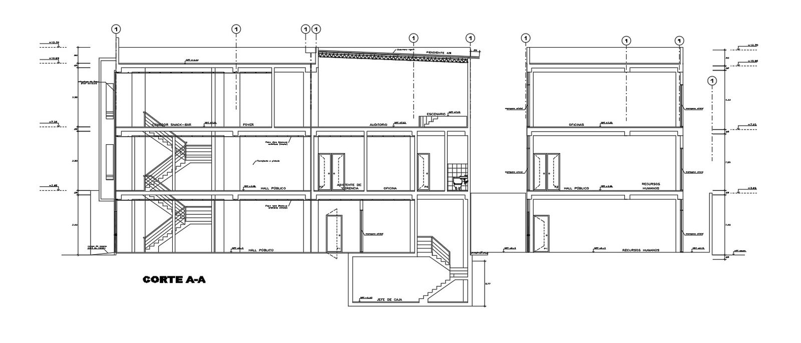 A section view of 17x35m bank building is given in this Autocad drawing file. Download the Autocad file.