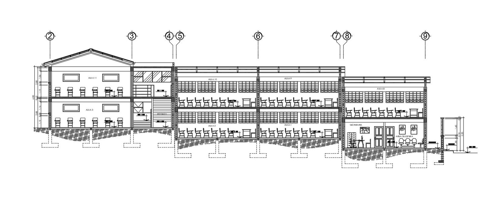 Front section view of 37x18m school building is given in this Autocad drawing file. Download the Autocad model.