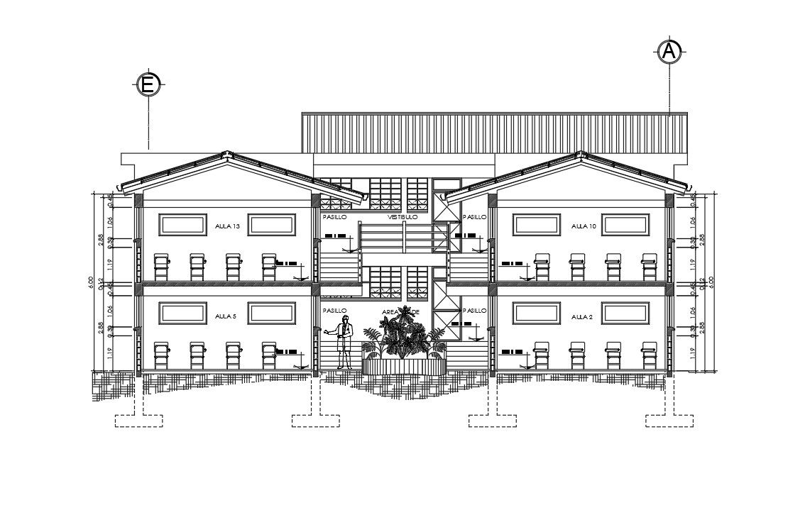 Left side section view of 37x18m school building is given in this Autocad drawing file. Download now.