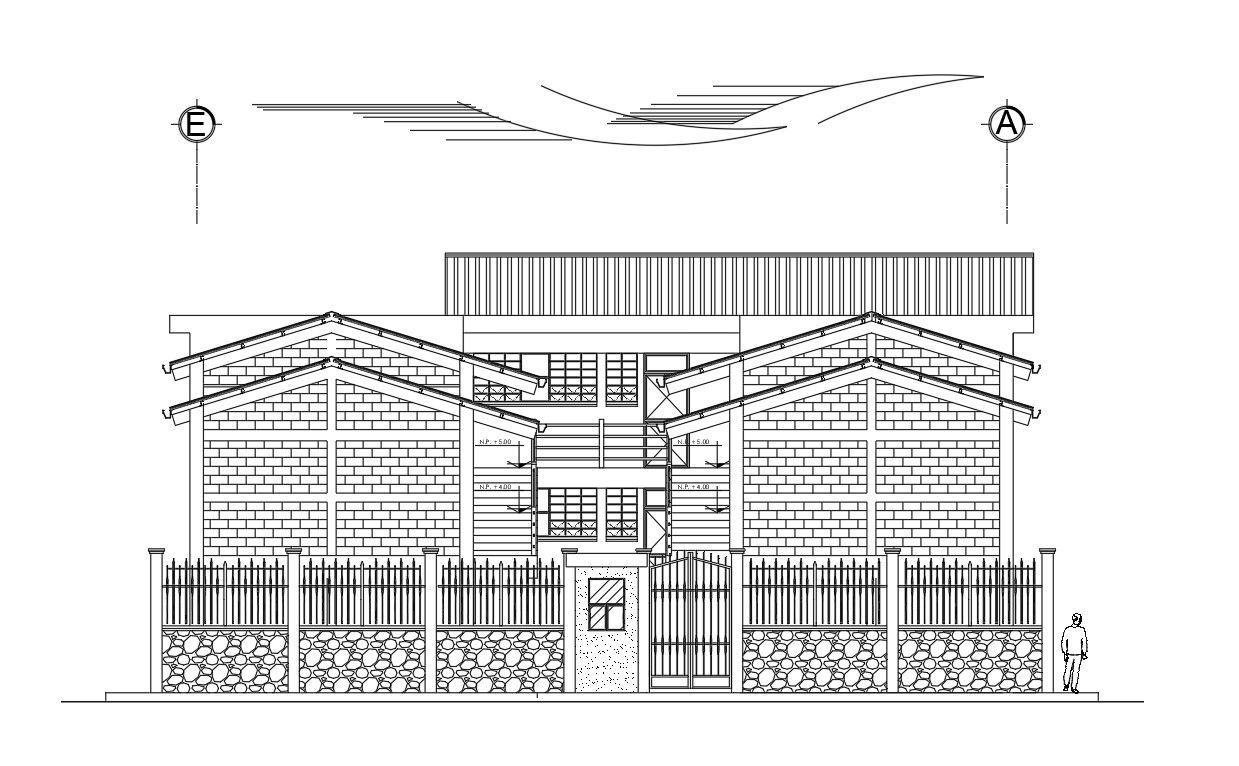 Left side elevation view of 37x18m school building is given in this Autocad drawing file. Download the Autocad model.