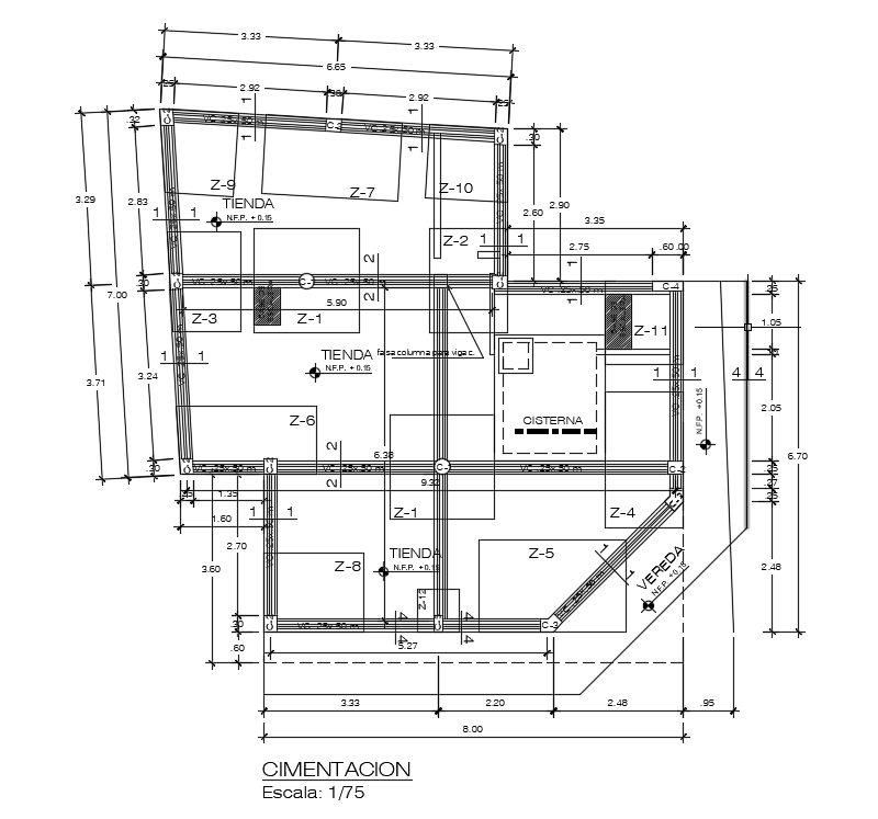 Foundation layout of 10x7m commercial shop plan is given in this Autocad file. Download now.