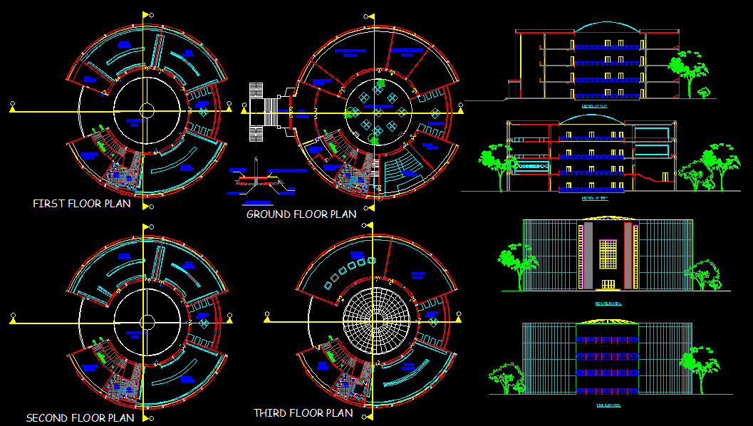This Museum Design 2D AutoCAD DWG Drawing features a well-planned architectural layout of a circular-shaped building that emphasizes symmetry and functionality. The design includes detailed floor plans for all four levels ground, first, second, and third floors—each furnished and organized for smooth visitor movement and exhibit display. The plans showcase the spatial hierarchy of exhibition halls, corridors, and seating zones, while the circular arrangement ensures a continuous flow and accessibility throughout the building.