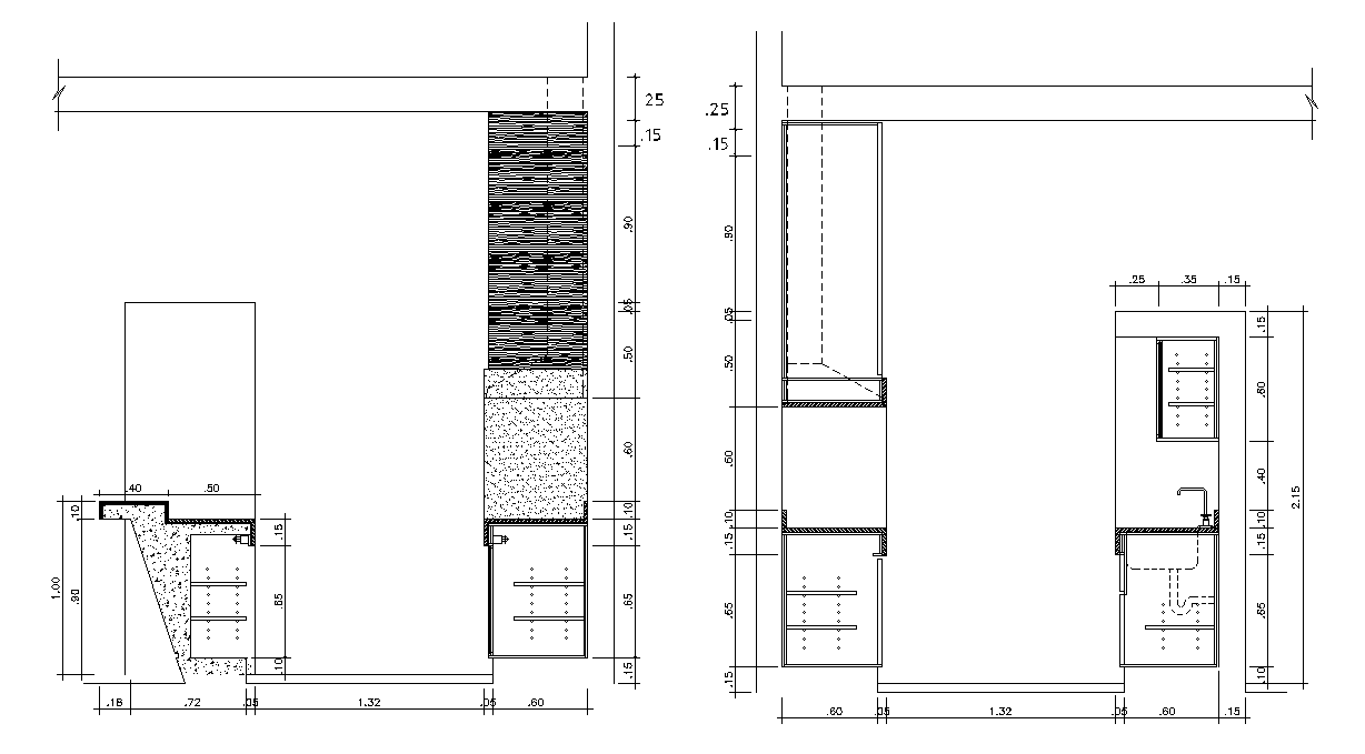 Side cut view of the kitchen interior detail drawing is given in this Autocad drawing file. Download the file.