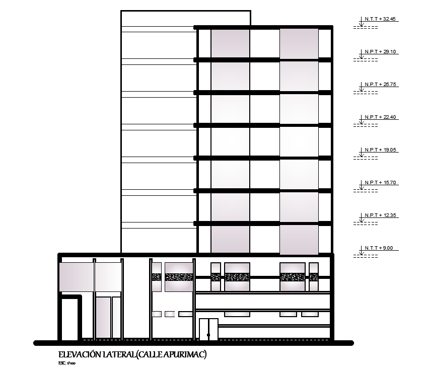 Front elevation view of 26x41m office building has been given in this Autocad drawing file. Total height of the building is 40m. This is G+10 floor office building. In this, auditorium, conference room, cafeteria, kitchen, car parking, dining area, director room, secretary room, work area, office rooms, foyer, water closet for male, water closet for female, and other details are available in this plan. For more details download the Autocad drawing file. Thank you for downloading the Autocad drawing file and other CAD program files from our website.