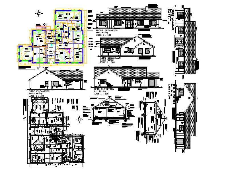 Modern exterior house designs. Ground Floor Plan design, Front side Elevation, side elevation, rear Elevation, Roof steel bar detail, section detail.