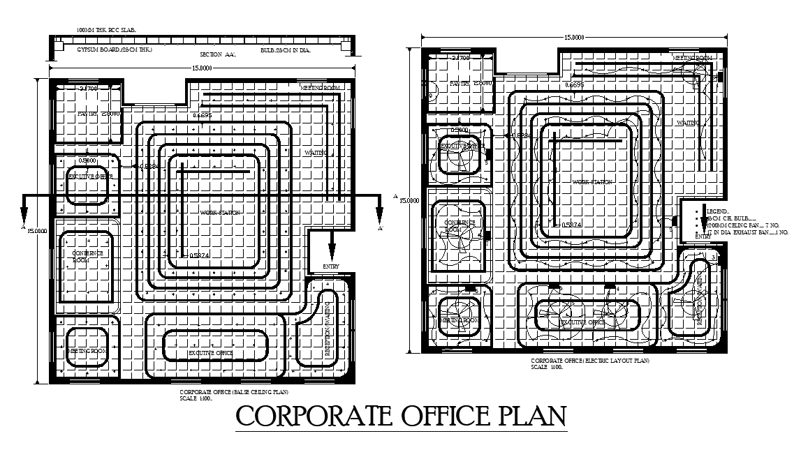 An electrical layout of 15x15m corporate building plan is given in this Autocad drawing file. Download now.