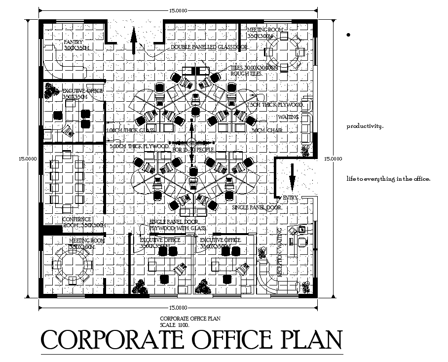 15x15m corporate building plan is given in this AutoCAD drawing file. This is single story building. Meeting room, conference room, single panel door, executive office, reception, waiting area, pantry, water closet and other details are available. For more details download the AutoCAD drawing file. Thank you for downloading the AutoCAD drawing file and other CAD program files from our website.