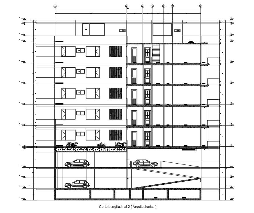 Left side section view of 50x43m commercial shop building is given in this Autocad drawing file.Download the AutoCAD model.