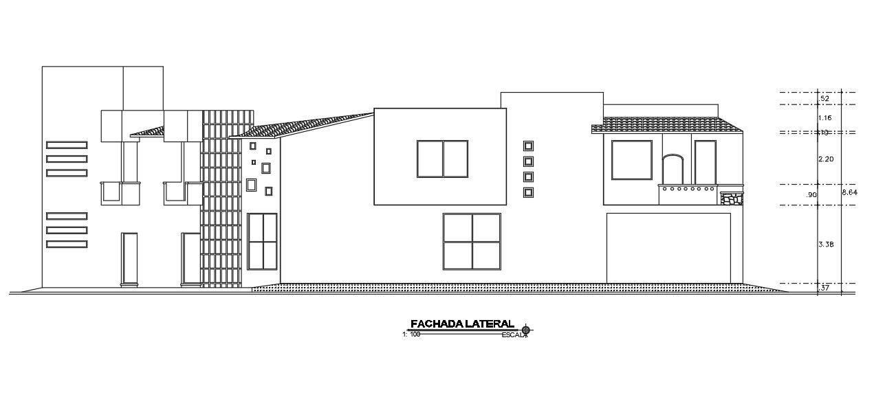 Left side elevation view of 20x15m guest house is given in this Autocad drawing file.Download the Autocad model.
