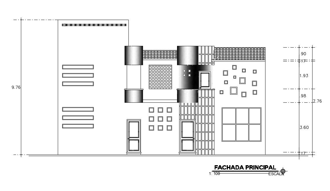 Front elevation view of 20x15m guest house plan is given in this Autocad drawing file. Download now.