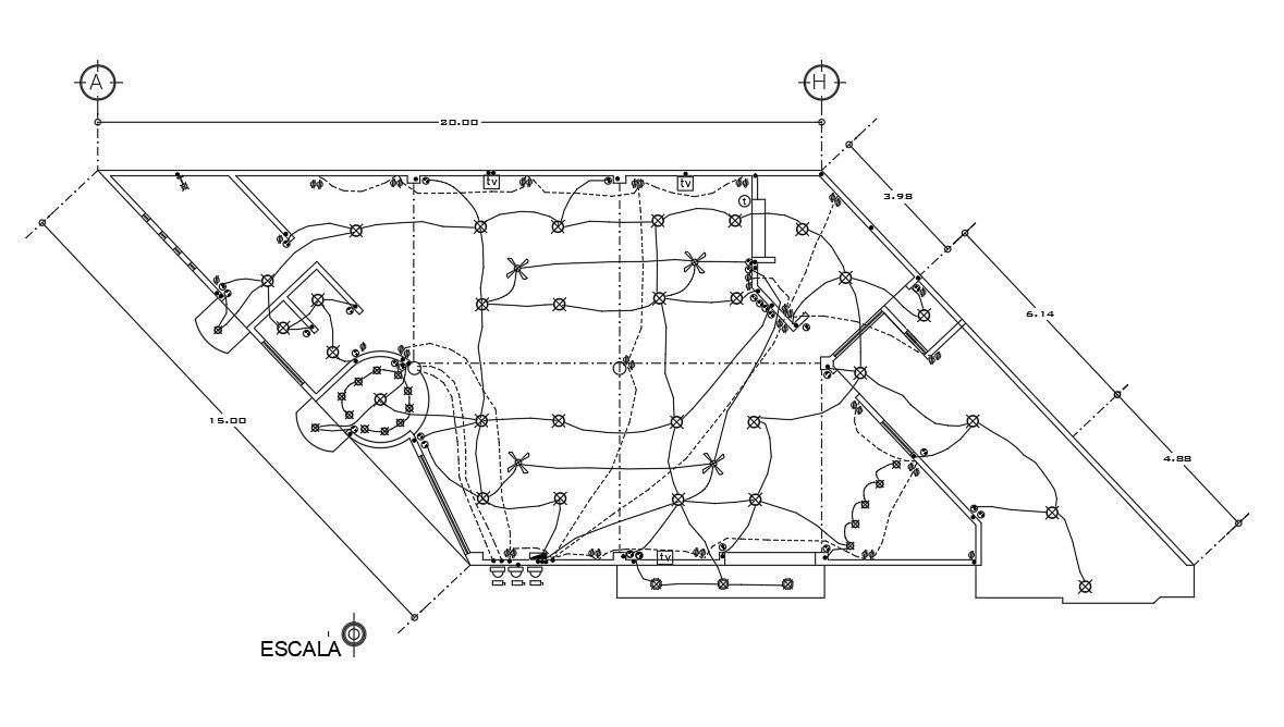 An electrical layout of 20x15m guest house plan is given in this Autocad drawing file. Download now.