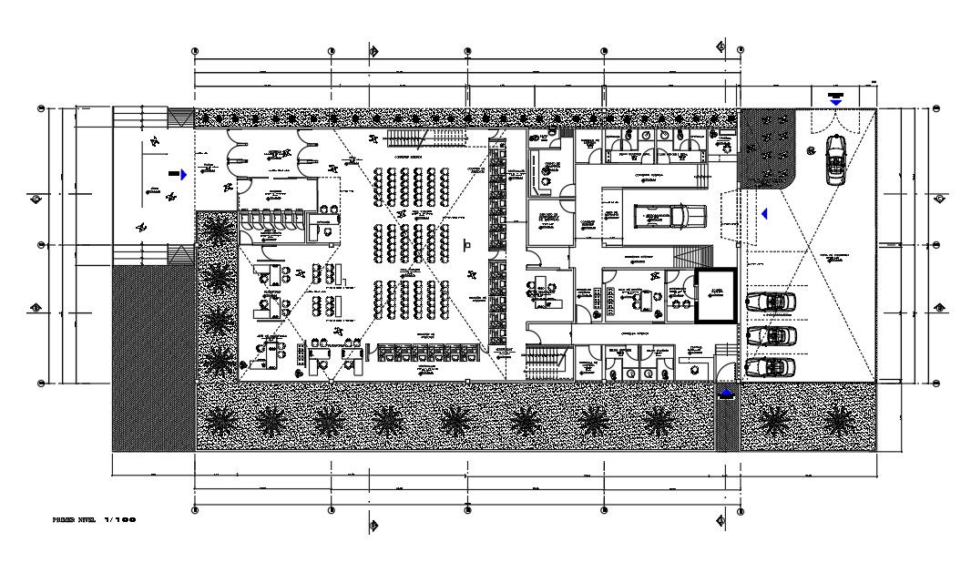 40x20m ground floor bank plan is given in this Autocad drawing file. Download the Autocad model.