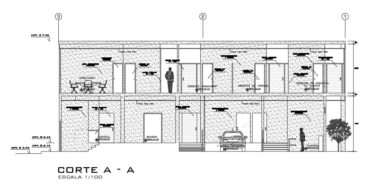 Left side section view of 40x20m bank building is given in this Autocad drawing file. This is G+1 bank building. In this ground floor, public hall, maintenance area, tellers, reports, anteboveda, cleaning cubicle, 1 parking lot, security instrument deposit, monitoring room, service counter, anchorage room, filter, atrium, head of booth and other details are mentioned. Head of area, secretary room, credit manager cabin, customer service manager cabin, general manager room, bar, living area, director room, gent’s toilet and ladies toilet is available in this first floor. For more details download the Autocad drawing file. Thank you for downloading the Autocad drawing file and other CAD program files from our website.