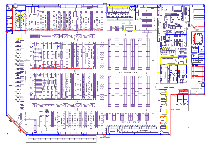 Commercial building floor plan dwg. Seasonal products, Area cash payments, main entry, GREAT ACCESSORIES FOR CHILDREN, FRESH MEAT SHOP, meeting room, bathroom space, cafearea, etc.