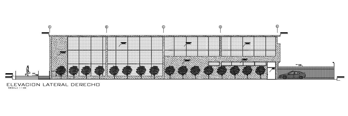 Right side elevation view of 40x20m bank building is given in this Autocad drawing file. Download the Autocad model.