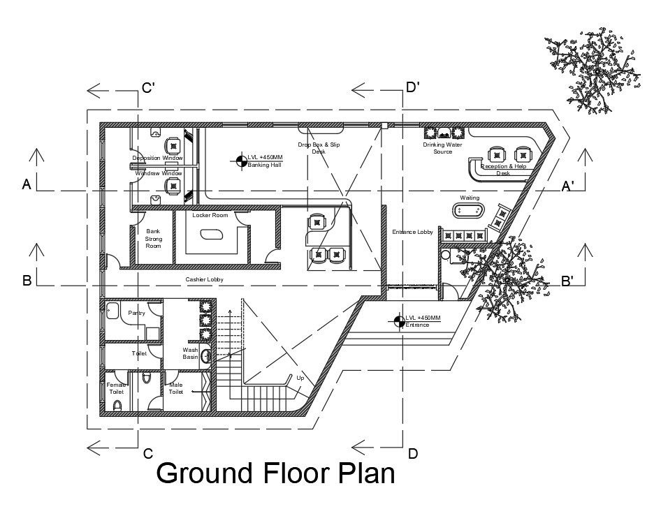 21x14m ground floor bank plan is given in this Autocad drawing file. Download the file.