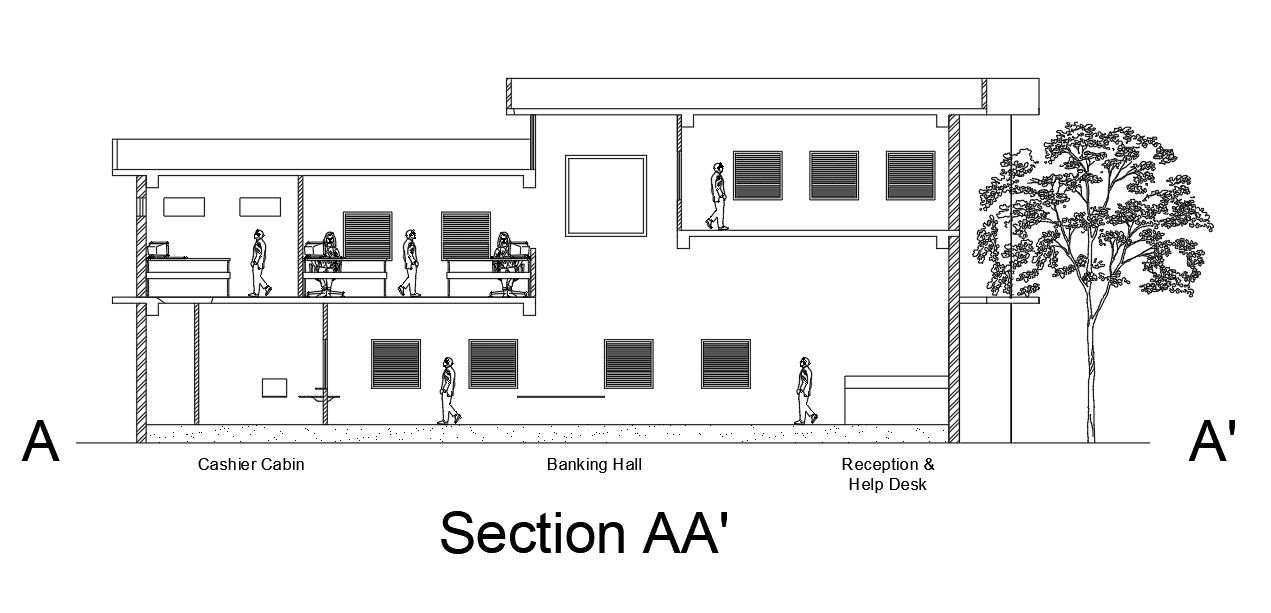 Front section view of 21x14m bank building is given in this Autocad drawing file. This is G+1 bank building. Entrance area, waiting area, drinking water source, reception & help desk, drop box & slip desk, banking hall, deposition windows, withdraw window, locker room, bank strong room, cashier lobby, toilet, male toilet, pantry, female toilet, and wash basin is available in this ground floor. Record room, server room, core banking hall, manager room, and conference room is available in this upper floor. For more details download the Autocad drawing file. Thank you for downloading the Autocad drawing file and other CAD program files from our website.