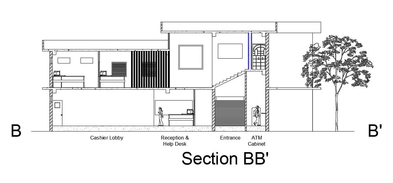 Back side section view of 21x14m bank building is given in this Autocad drawing file. Download the Autocad model.