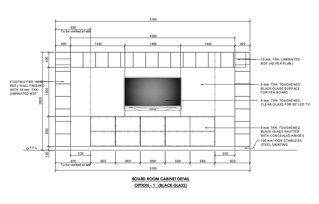 51x26m bank board room cabinet with black glass is given in this Autocad drawing file. Material details are given in this model. Existing fire hose reel wall finished with 18mm thickness laminated MDF, 8mm thickness of toughened black glass surface for pen board, 100mm high stainless steel skirting and other details are mentioned in this model. For more details download the AutoCAD drawing file. Thank you for downloading the Autocad drawing file and other CAD program files from our website.