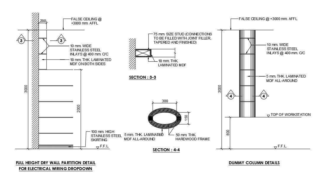 Full height dry wall partition detail drawing for electrical wiring dropdown is given in this Autocad drawing file. This is given for 21x14m bank building. 10mm wide stainless steel, 18mm thickness of laminated MDF, 100mm high stainless steel skirting and other details are mentioned in this model. For more details download the AutoCAD drawing file. Thank you for downloading the Autocad drawing file and other CAD program files from our website.
